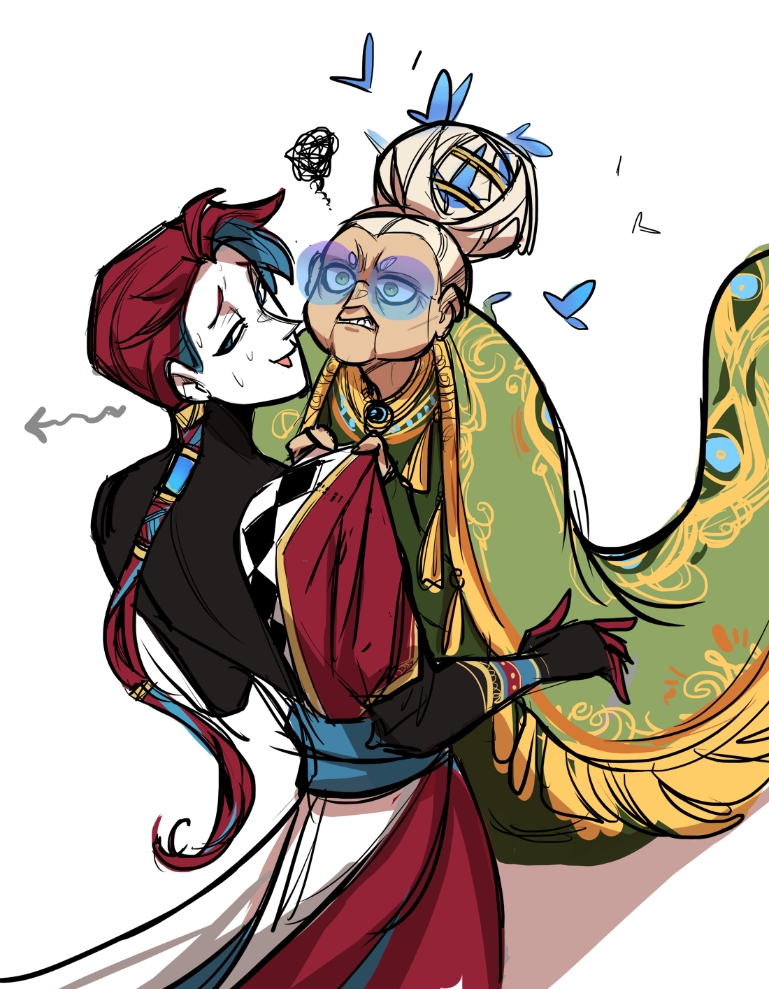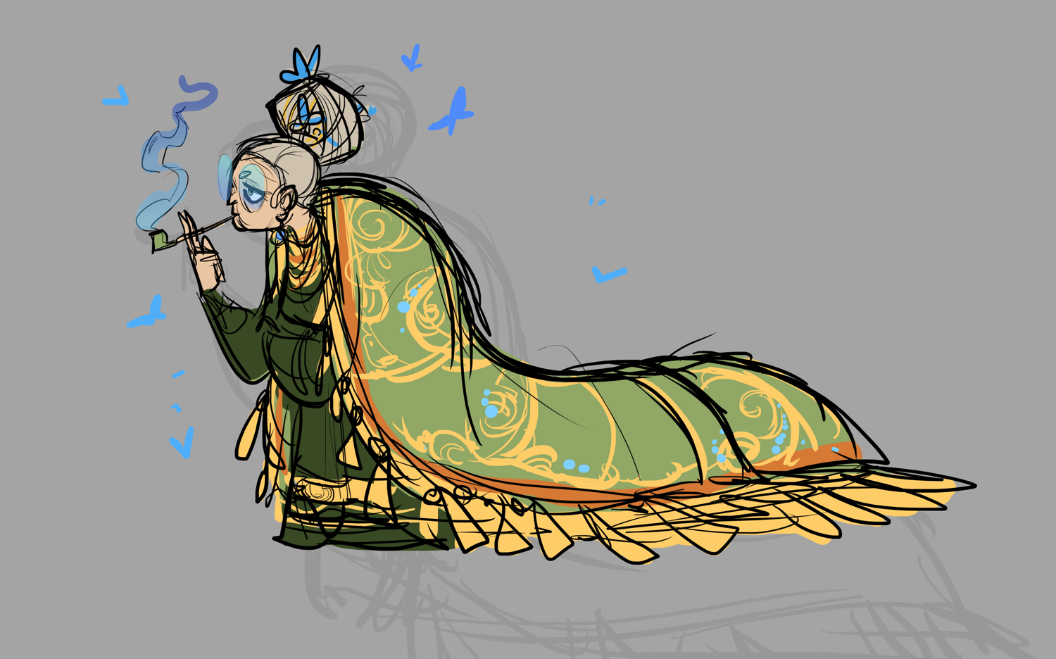 Вдова из небольшого средневекового города, Беатрис работала в смешанном цеху, занималась вышивкой, ткала. В этом деле она была бесконечно искусна, по всеобщему признанию, и лелеяла мечты работать при дворе, но в какой-то момент здоровье подвело ее: затяжная болезнь дала осложнения на ноги. А когда стали подводить еще и руки, то ее аккуратно попросили из цеха. Тогда и засветился Джестер с предложением шить для него: он часто выбирался в нашу реальность развеяться, а работы Беатрис его привлекли. Бедняга была искренне уверена, что по ее душу пришел бес (и то, что Джестер тогда даже не пытался косить под человека, не помогало), но... уж лучше работа на беса, нежели медленное угасание без цели. Он и с телом помог, как сумел, за что до сих пор периодически огребает (с другой стороны - теперь она не ограничена в нитях, лол).