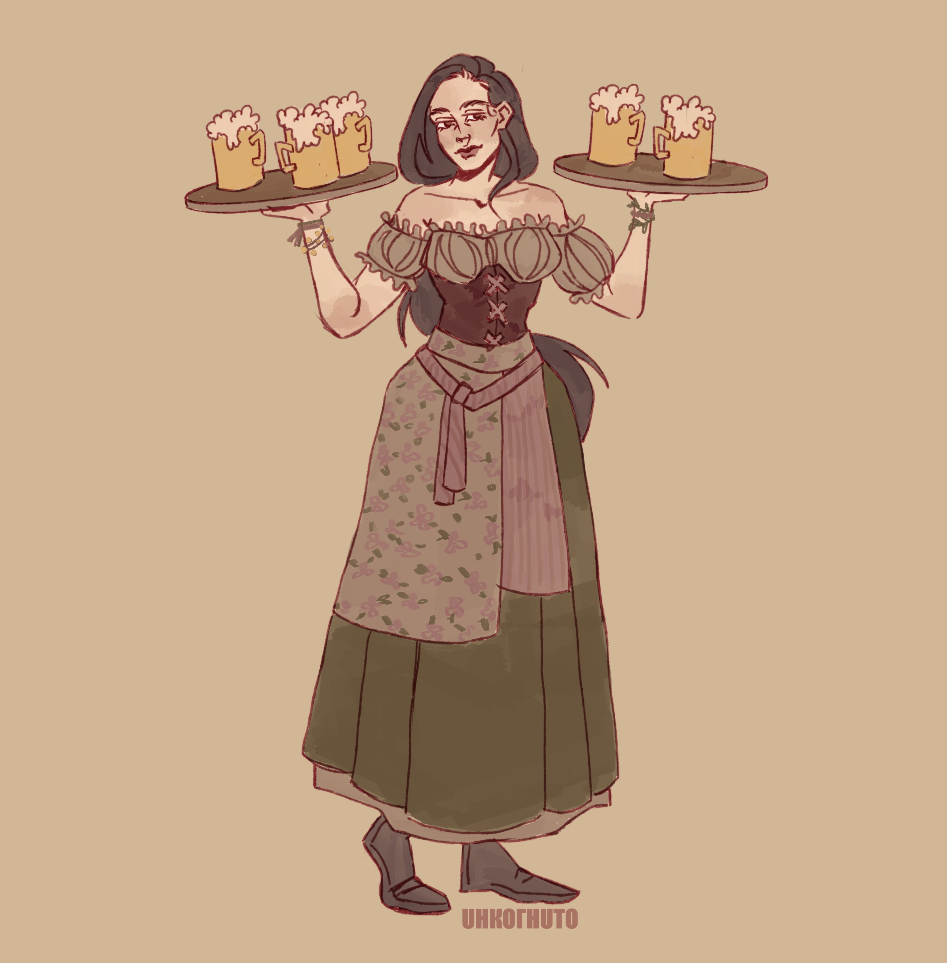 Одежда: практичная, но с элементами ведьмовского стиля — платье с узорами, фартук с карманами для трав и зелий, амулеты на руках.