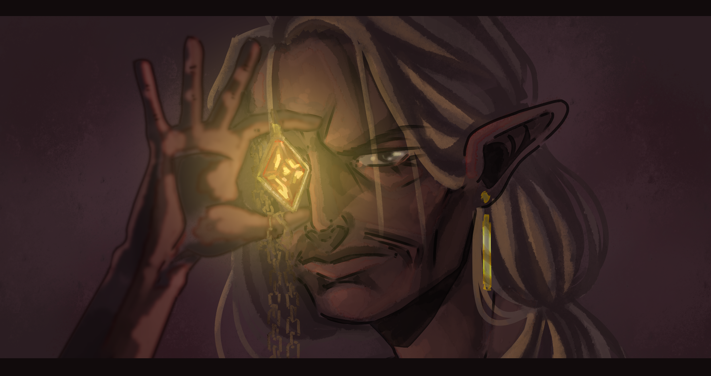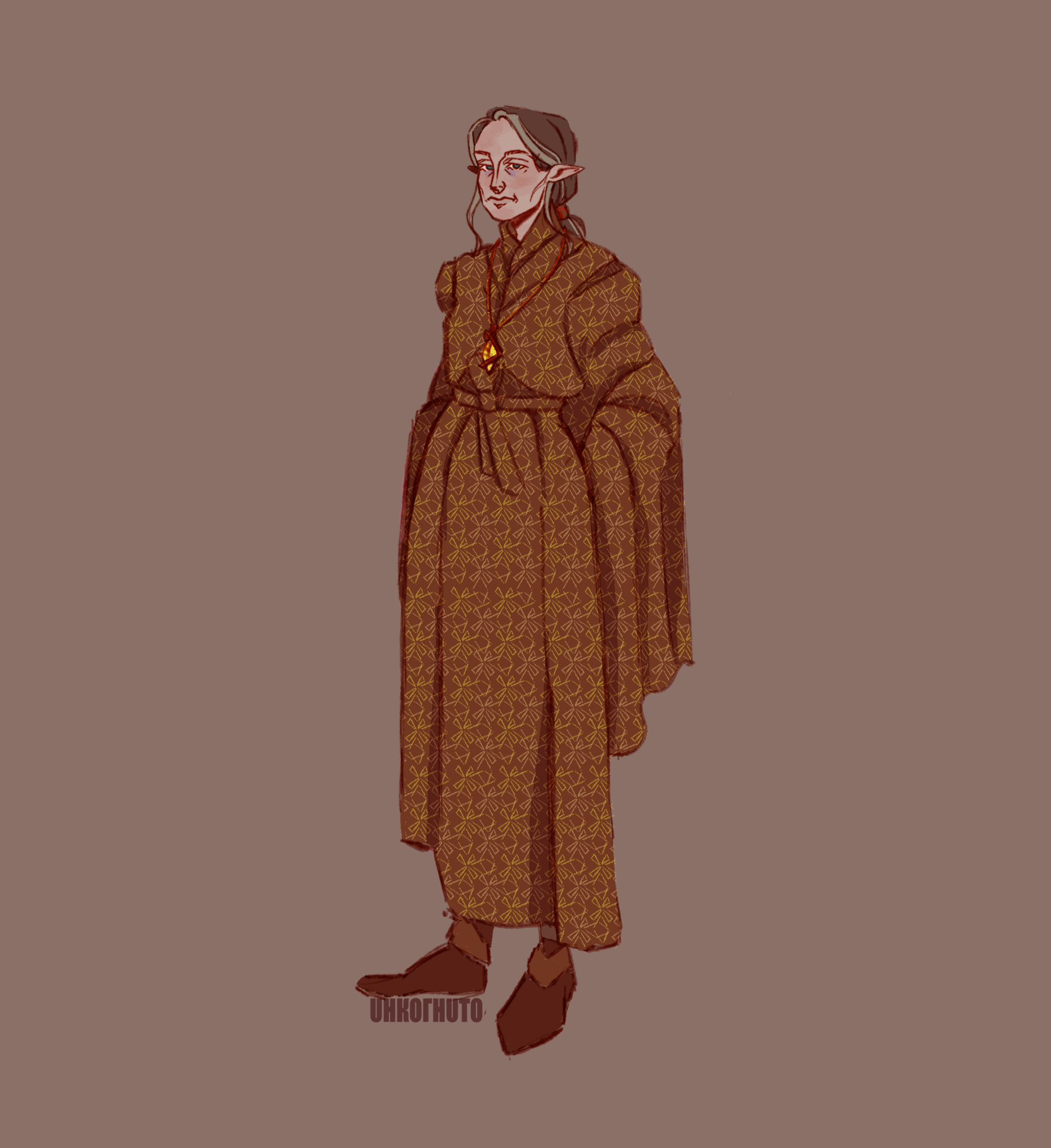 Одежда: Марлин носит длинный, тёплый терракотовый камзол из тончайшей шерсти, расшитый золотыми и медными нитями в виде геометрических узоров. На груди - массивная медный кулон в форме вытянутого геометрического листа, символ его власти и неприступности. На поясе - изящный меч с рукоятью, украшенной янтарём.