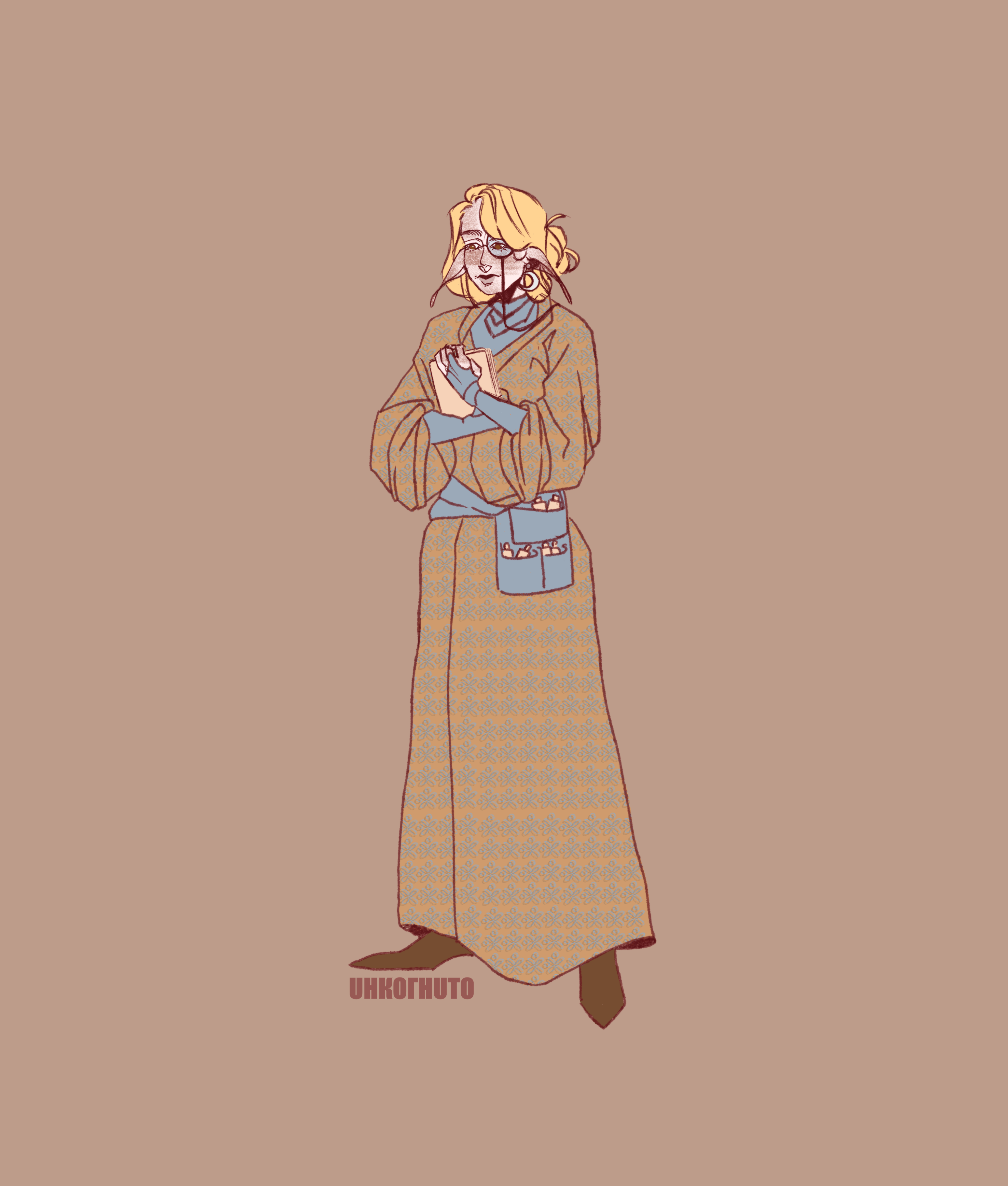 Одежда: Льняное платье в жёлто-голубых тонах с карманами, набитыми травами и флаконами. Практичная, но с налётом забытой эльфийской эстетики.
