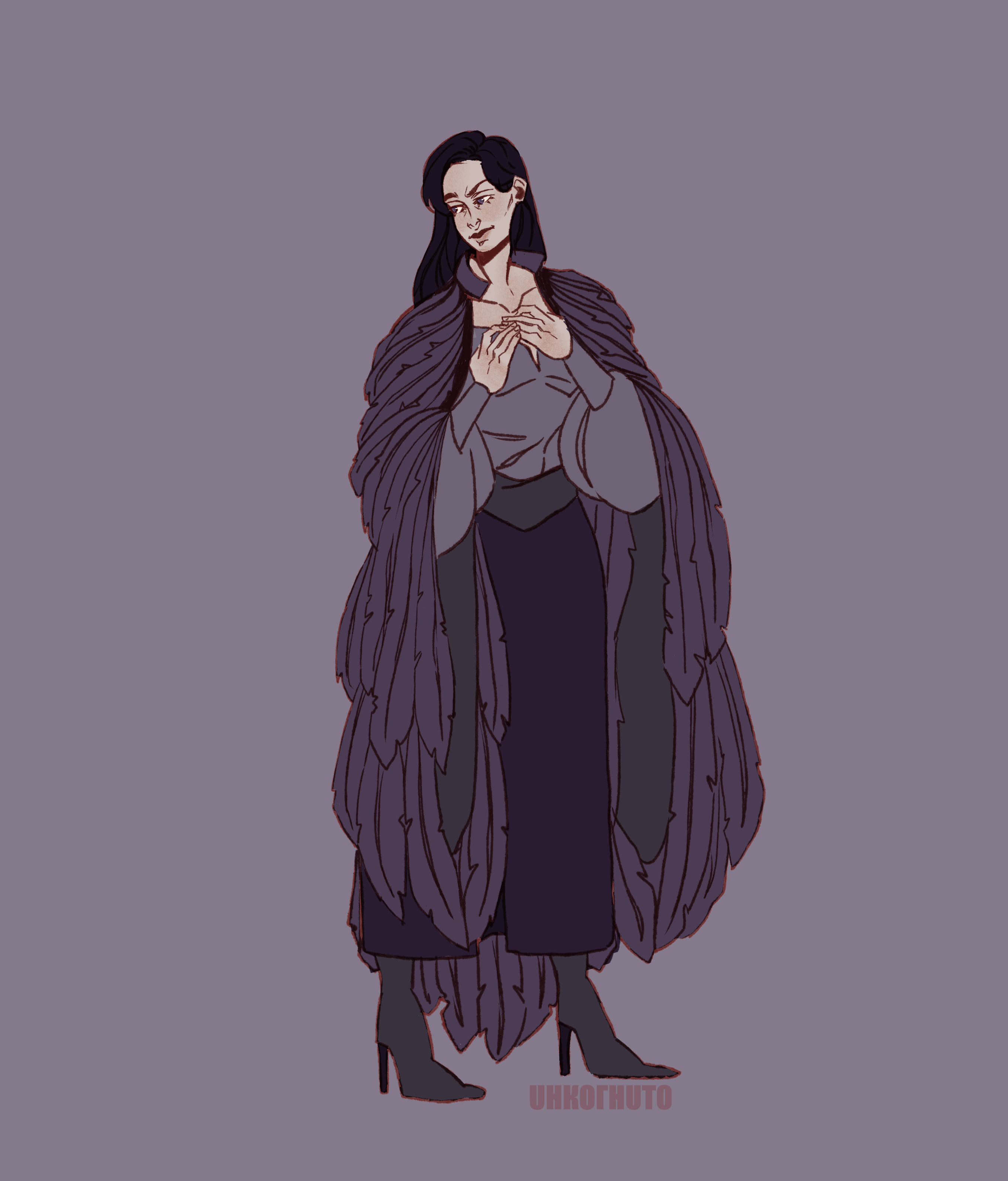 Одежда: длинное чёрное платье, украшенное перьями, подчёркивающее холодную элегантность
