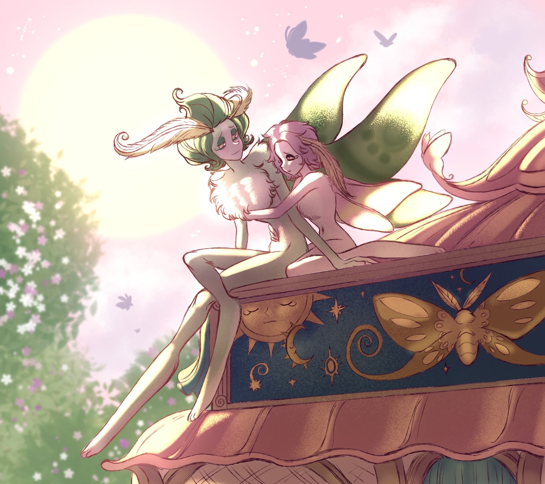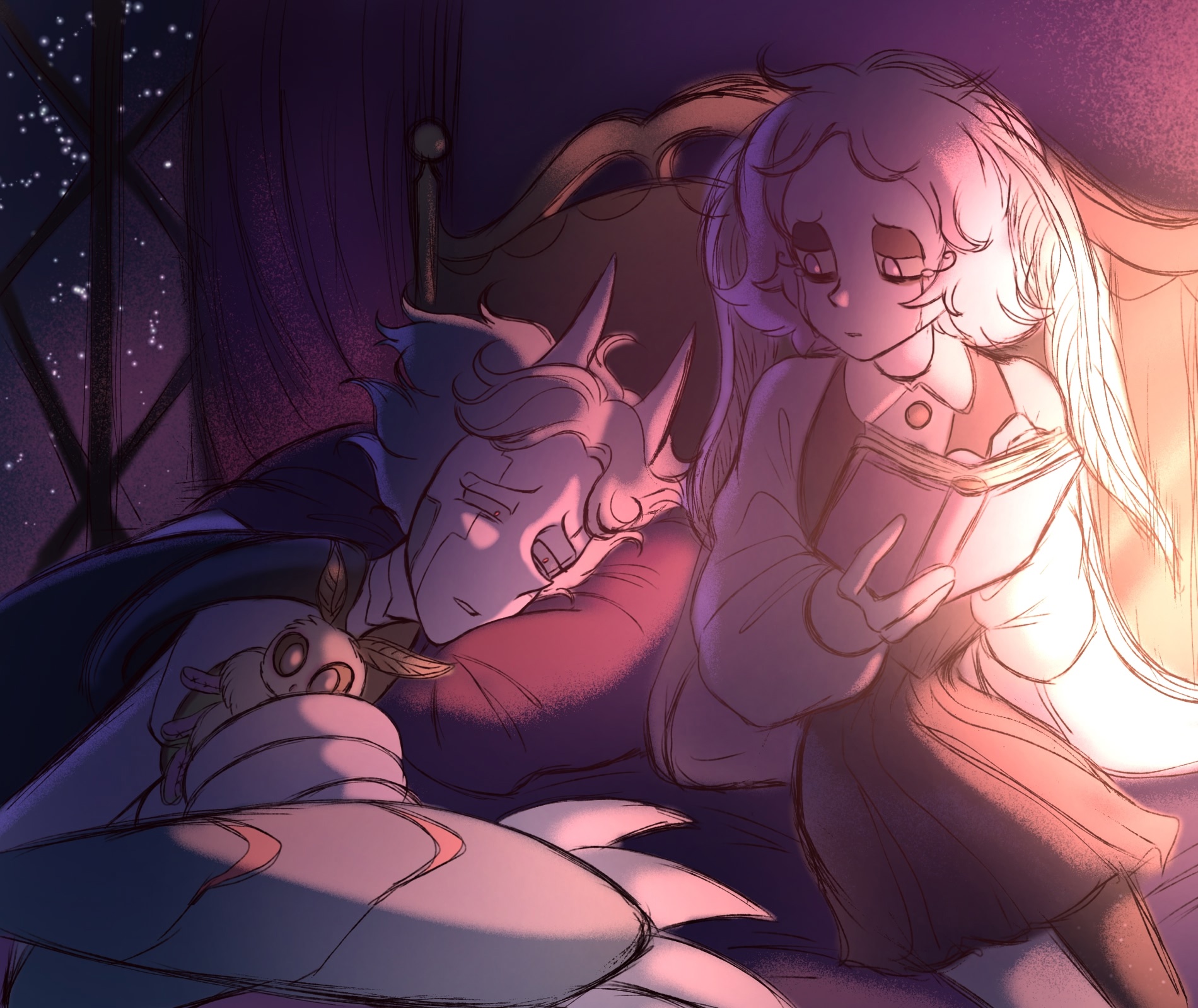 На рисунке Созерцатель Звёзд и Люми уединились на крыше небольшого домика и греются на солнышке.